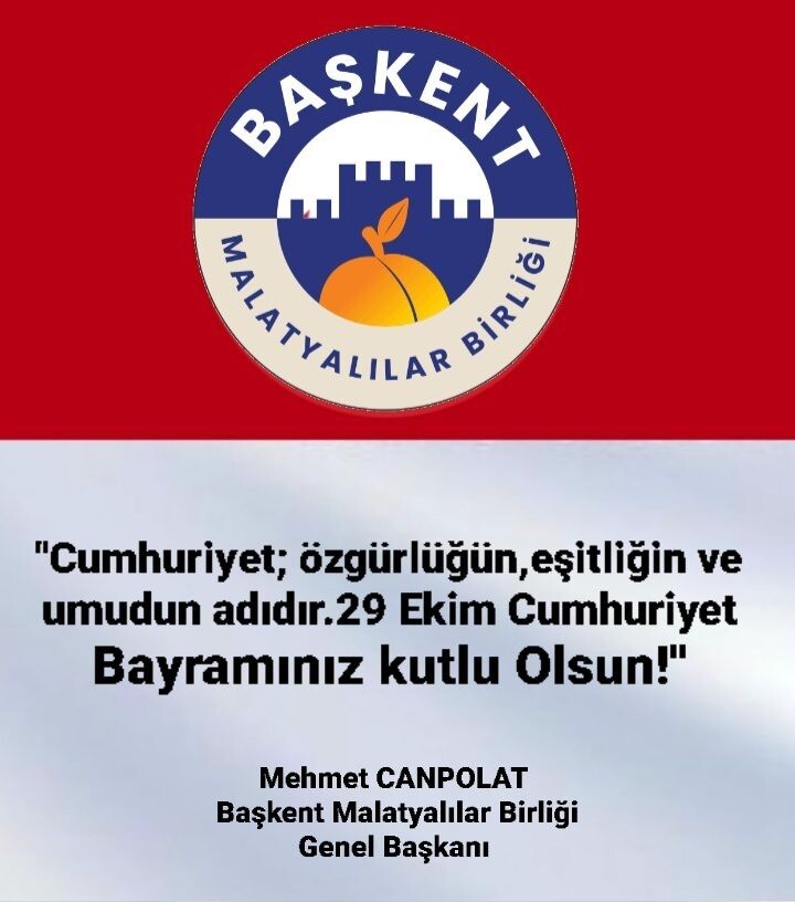 Başkent Malatyalılar Birliği Genel Başkanı Mehmet Canpolat Mesajında, bu anlamlı günde başta ülkemizin kurucusu Gazi Mustafa Kemal Atatürk olmak üzere aziz vatanımız için mücadele eden tüm kahramanlarımızı rahmet, minnet ve şükranla anıyorum. Milletimizin ve tüm hemşehrilerimizin 29 Ekim Cumhuriyet Bayramı’nı en içten dileklerimle kutluyorum” dedi.