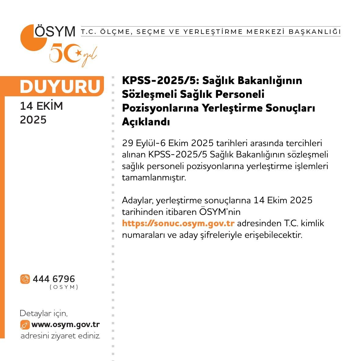 Adaylar, yerleştirme sonuçlarına 14 Ekim 2025 tarihinde saat 15.00’ten itibaren ÖSYM’nin https://sonuc.osym.gov.tr adresinden T.C. kimlik numaraları ve aday şifreleriyle erişebilecektir.