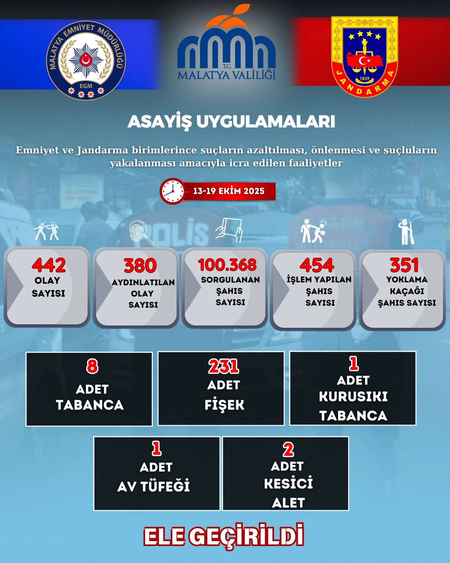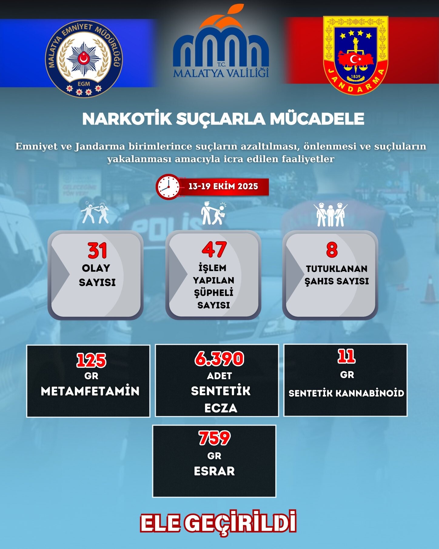 Malatya’da 13-19 Ekim tarihlerinde düzenlenen asayiş, trafik ve narkotik operasyonlarında çok sayıda kişi yakalanırken, silah ve uyuşturucu maddeler ele geçirildi.