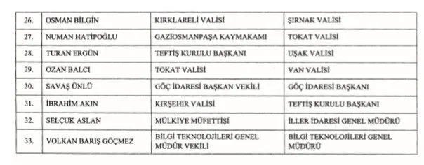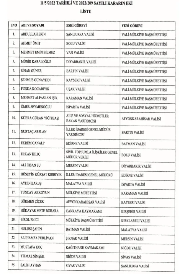 Aile ve Sosyal Hizmetler Bakan Yardımcısı Kübra Güren Yiğitbaşı Afyon Karahisar’a, İller İdaresi Genel Müdürü Hüseyin Kürşat Kırbıyık Edirne’ye, Sivil Toplumla İlişkiler Genel Müdür Vekili Erkan Kılıç Bolu’ya, Teftiş Kurulu Başkanı Turan Ergün Uşak’a, İller İdaresi Genel Müdür Yardımcısı Nurtaç Arslan Bartın’a, Çankaya Kaymakamı Hüdayar Mete Buhara Kırşehir’e, Mülkiye Başmüfettişi Birol Ekici Kırklareli’ye, Kağıthane Kaymakamı Mustafa Koç Niğde’ye, Gaziosmanpaşa Kaymakamı Numan Hatipoğlu Tokat’a vali oldu.
